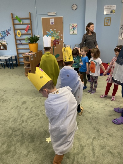 Povánoční čas jsme oslavili svátkem tří králů a jejich poselstvím. Děti se rozloučily s loňským rokem pomocí pokusu "prskavka v mandarince" a vyrobily si kartonové tiché rachejtle. Myšlenkovou mapou poté zamávaly roku 2023 i s pomocí rodičů při ranním úkolu. Opisovaly a zdobily písmena, nejvíce je zaujala výroba papírové koruny. Vytvořily také ze špalku tři krále a za pomoci křídy napsaly na dveře K+M+B 2024.