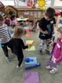 Děti samy pracovaly u stolku a míchaly základní barvy v miskách, poté pipetou ťupkaly na předlohu správně barevné kapky, kdy následně přiložily papírovou útěrku a vznikly tak rozpyté barvy.