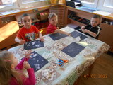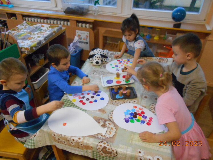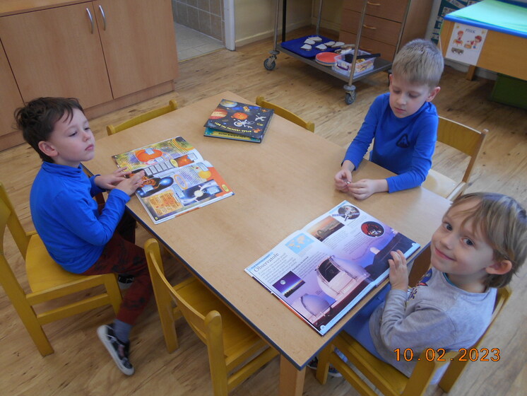 V únoru jsme procestovali celou galaxii. Vesmírné téma bylo zajímavé a obsáhlé, poznávali jsme planety, hráli si na Sluneční soustavu, vyráběli vesmírná tělesa a sestavovali souhvězdí. Vyzkoušeli jsme si spoustu netradičních výtvarných technik, například malování zubní pastou, zapouštění barev a práci s pastely. Na konci února probíhaly přípravy na masopust, tvořili jsme masky, modelovali jitrnice a zdobili papírové balónky.